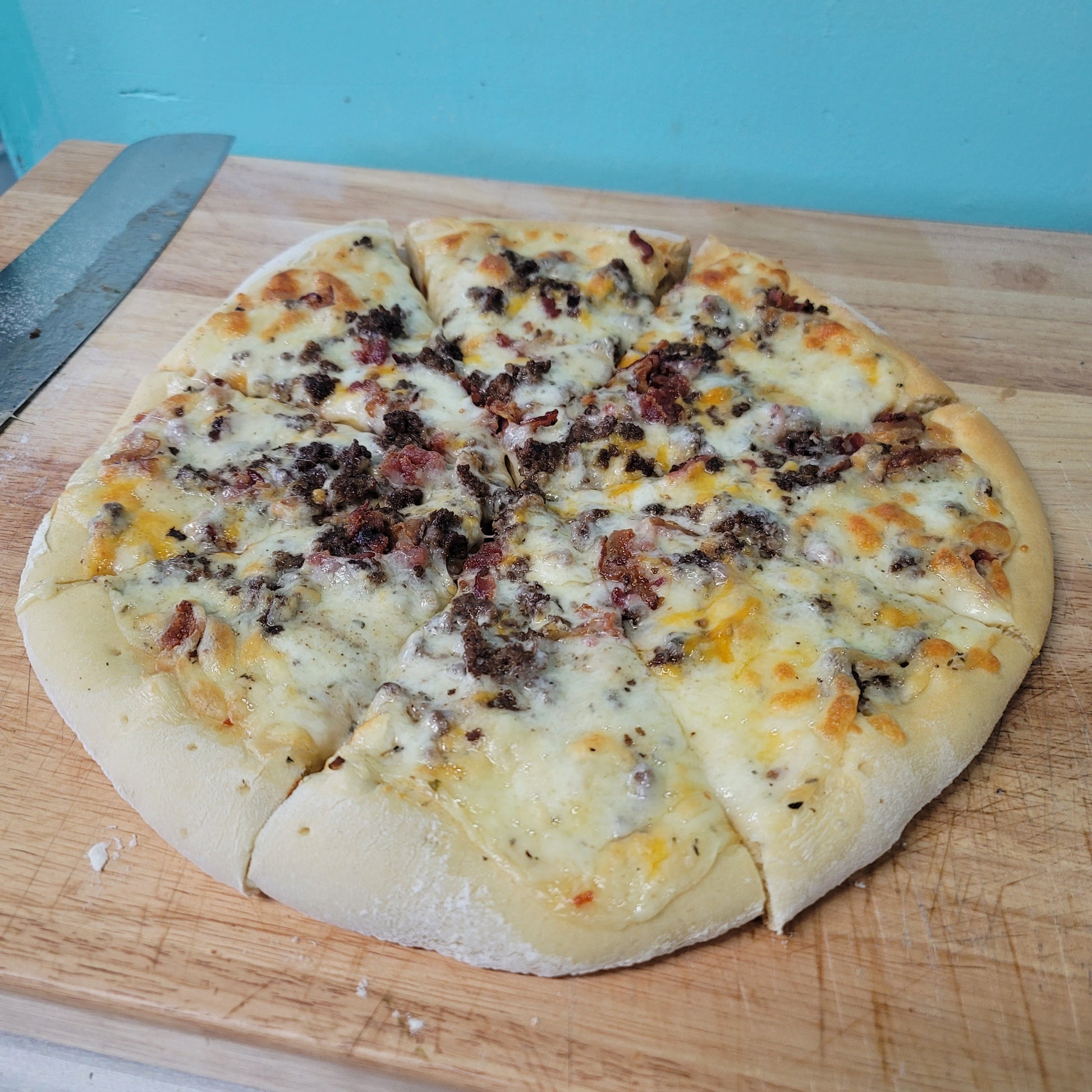 Ground beef, bacon, onion, house cheese blend, garlic, salt & pepper, on your choice of our house red sauce or Alfredo on our home style sourdough starter crust!
