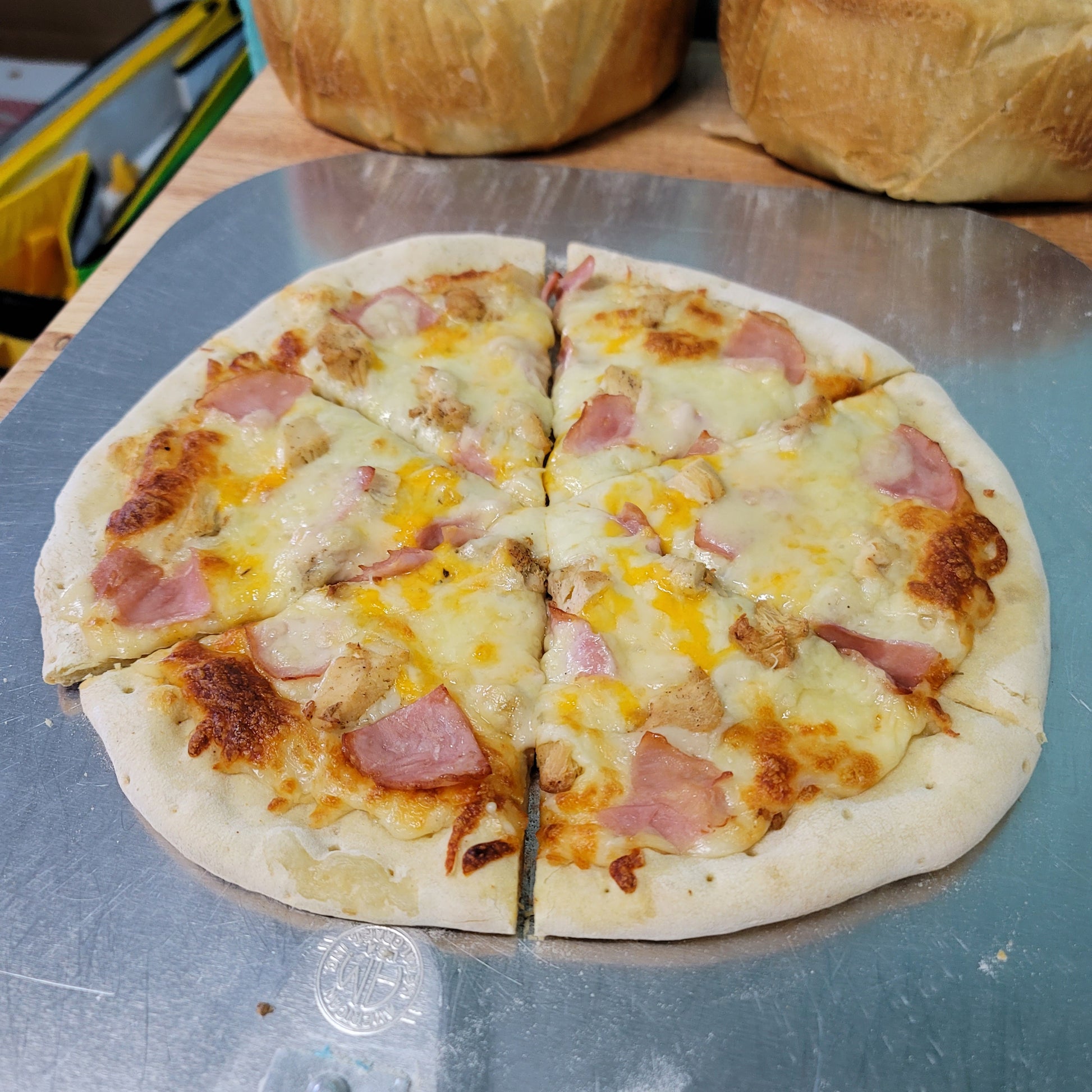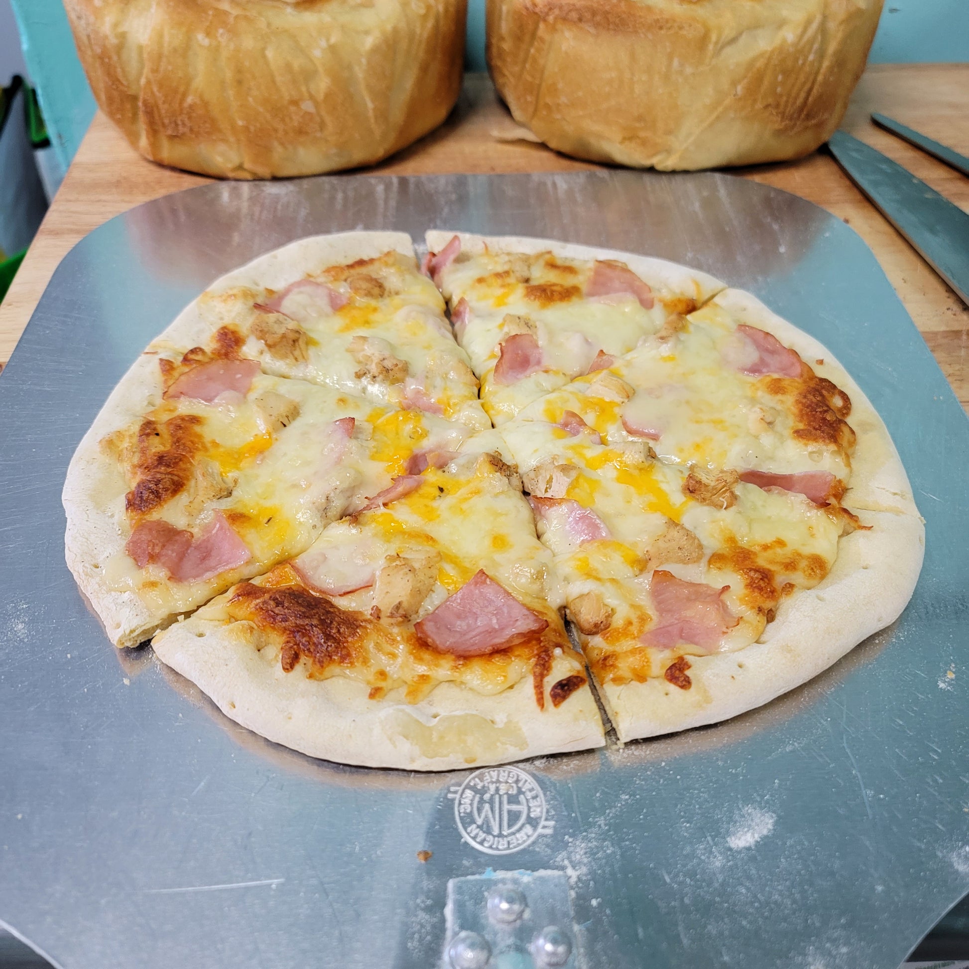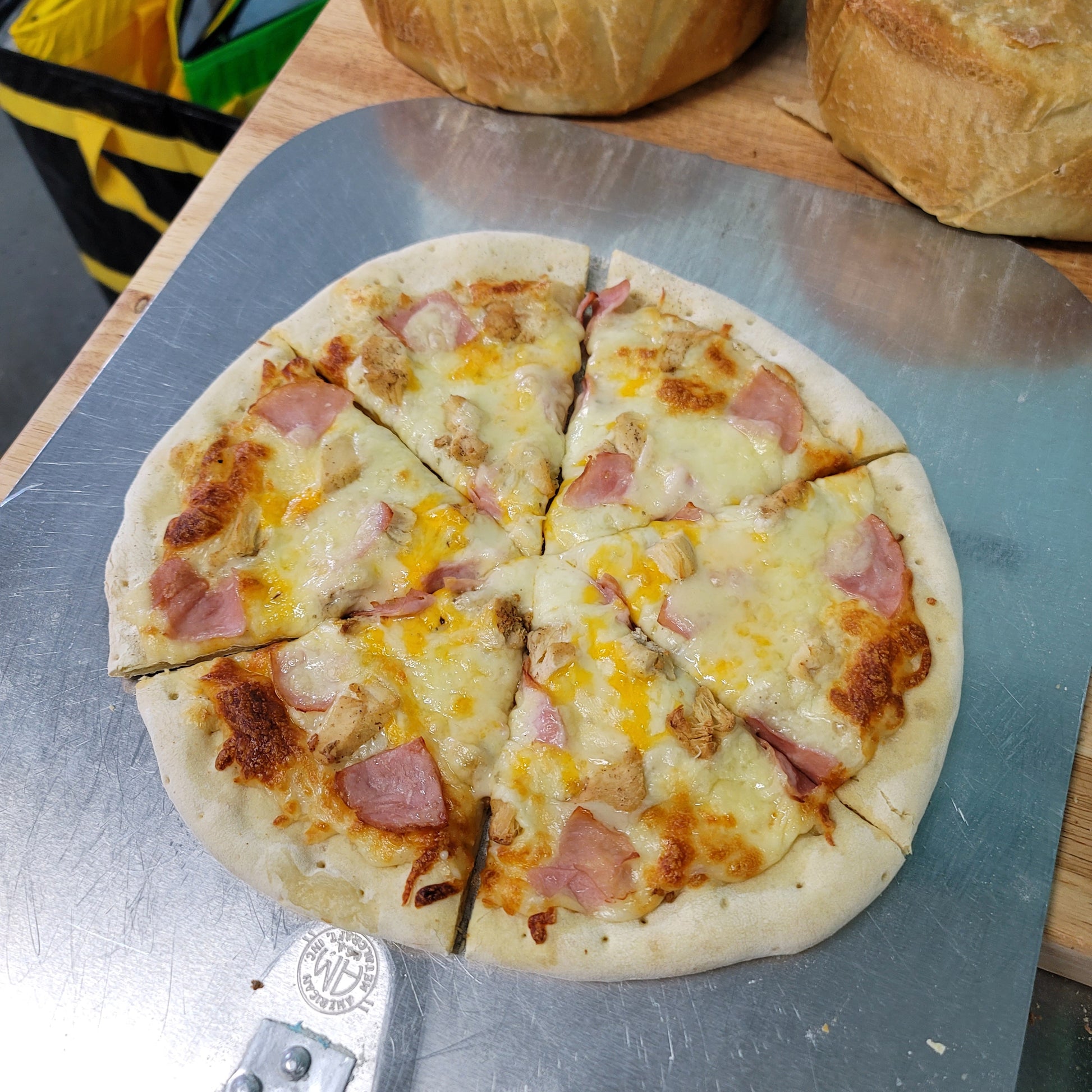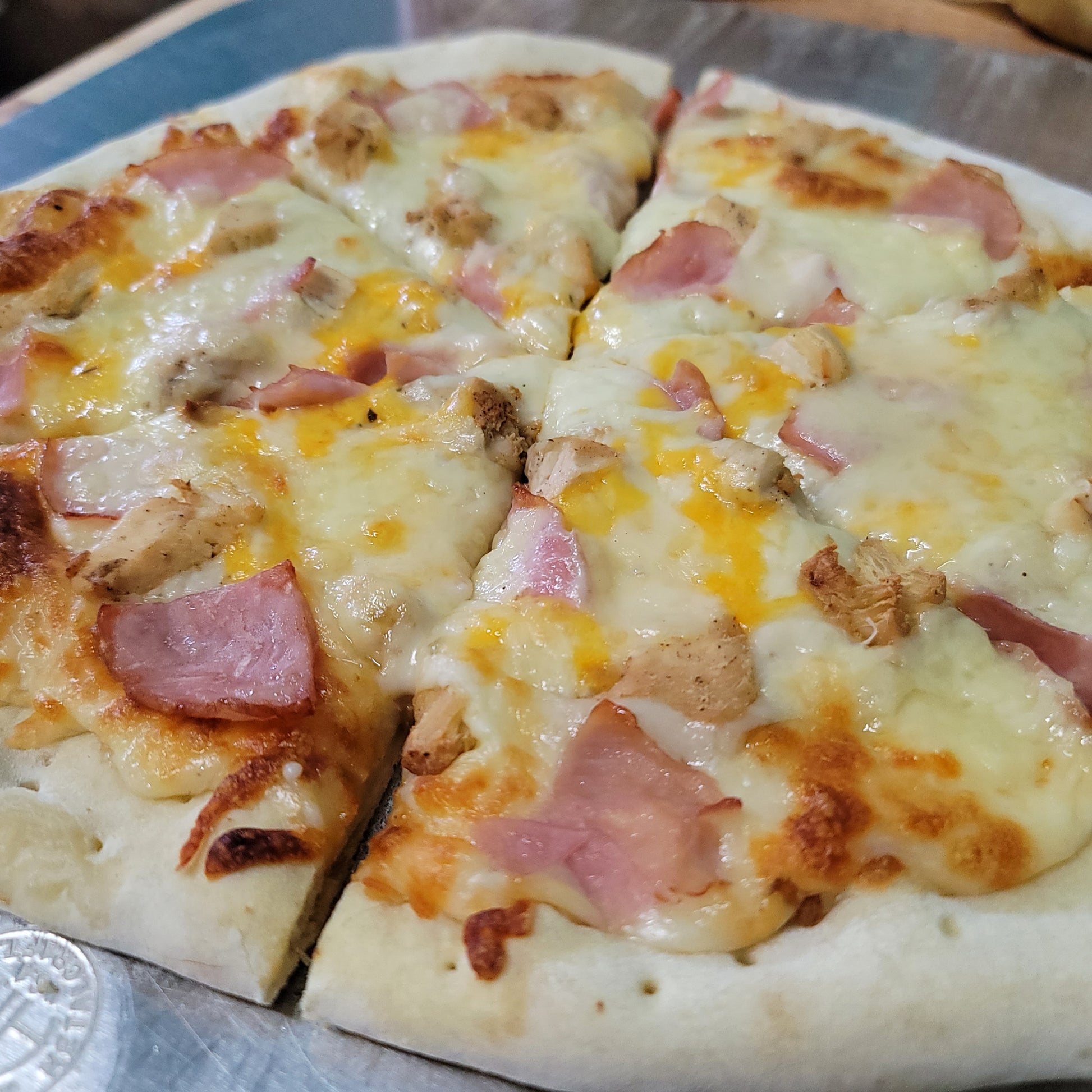 This Chicken cordon bleu inspired pizza features Canadian bacon, All white meat season grilled chicken breast, Swiss cheese, white sauce, and our house cheese blend on our home style crust!