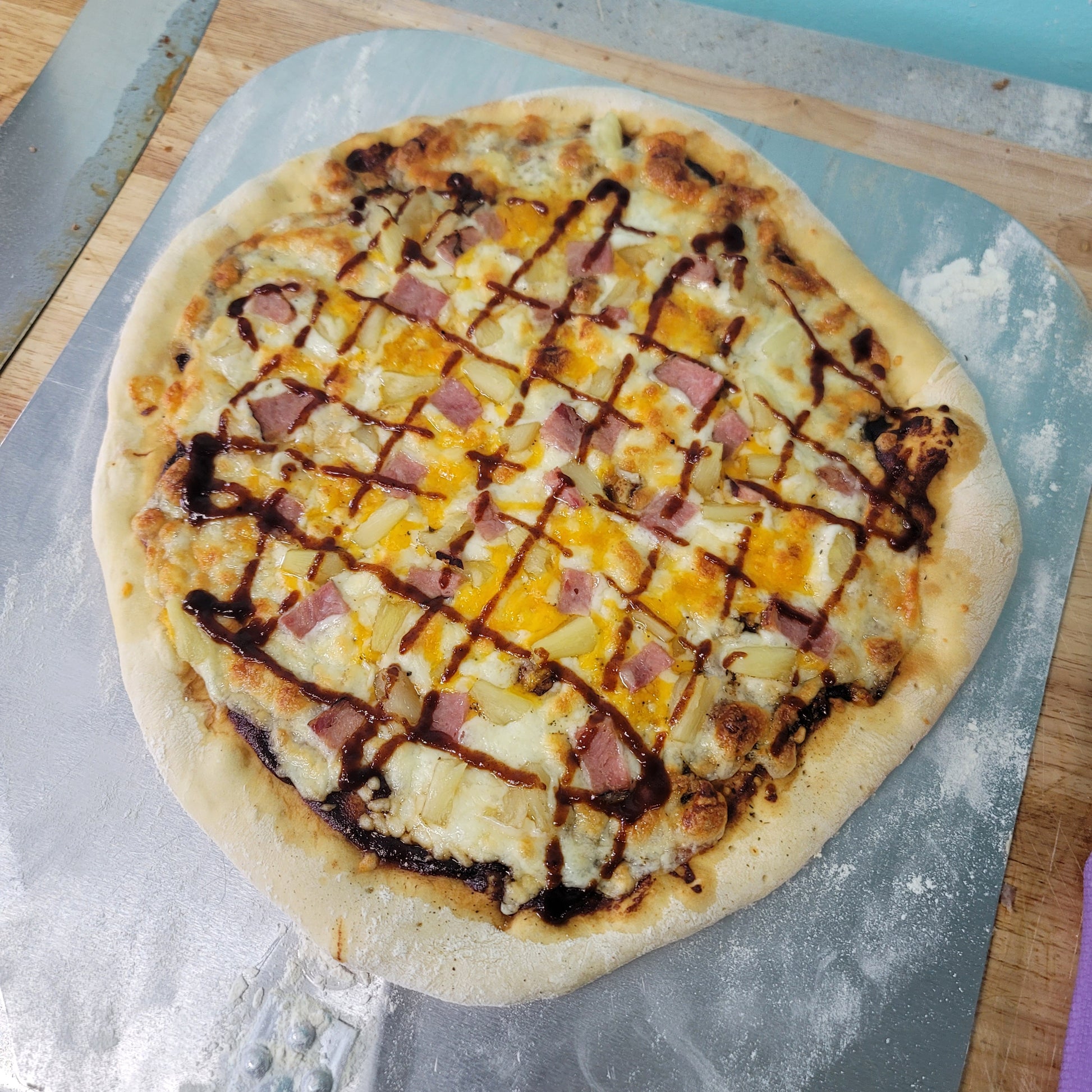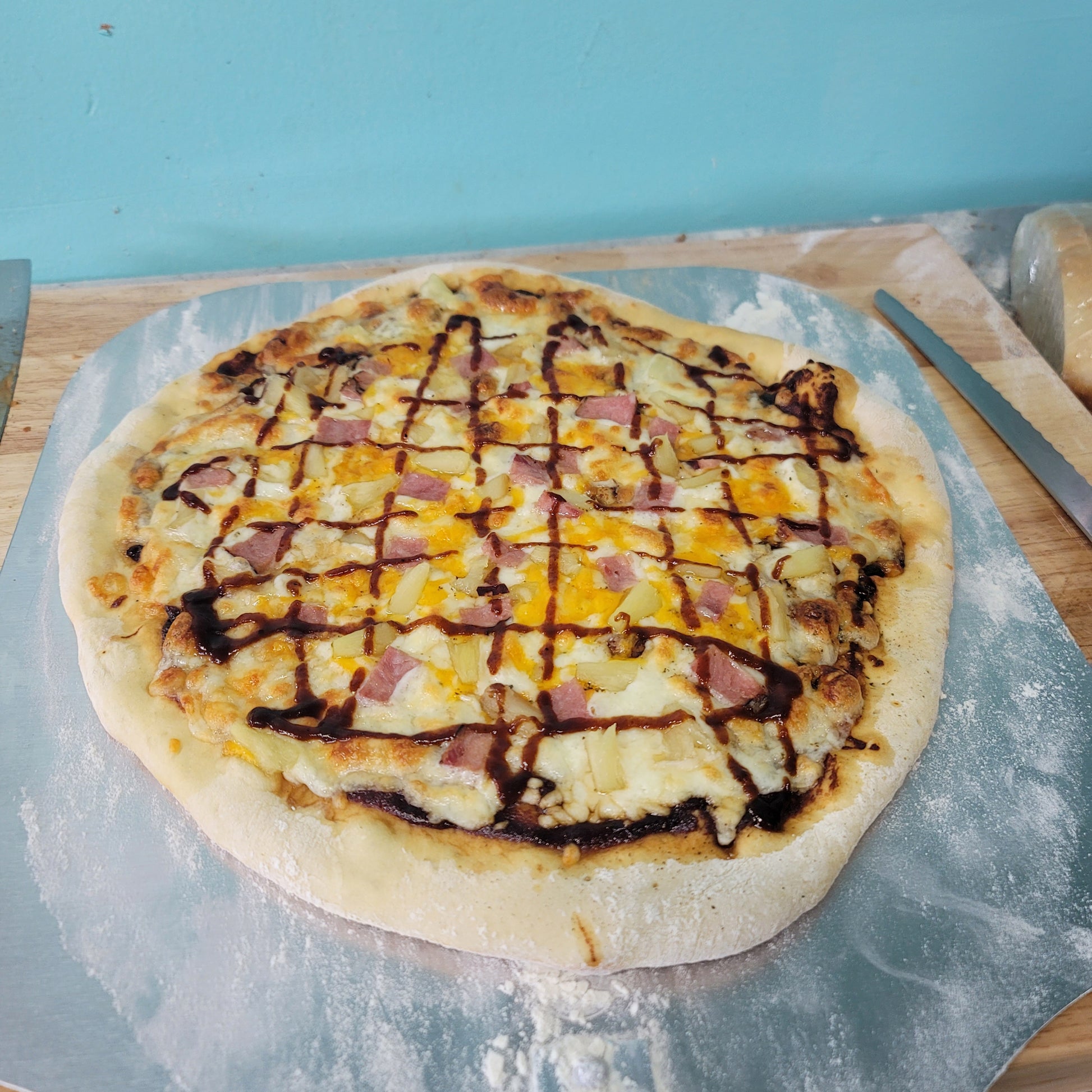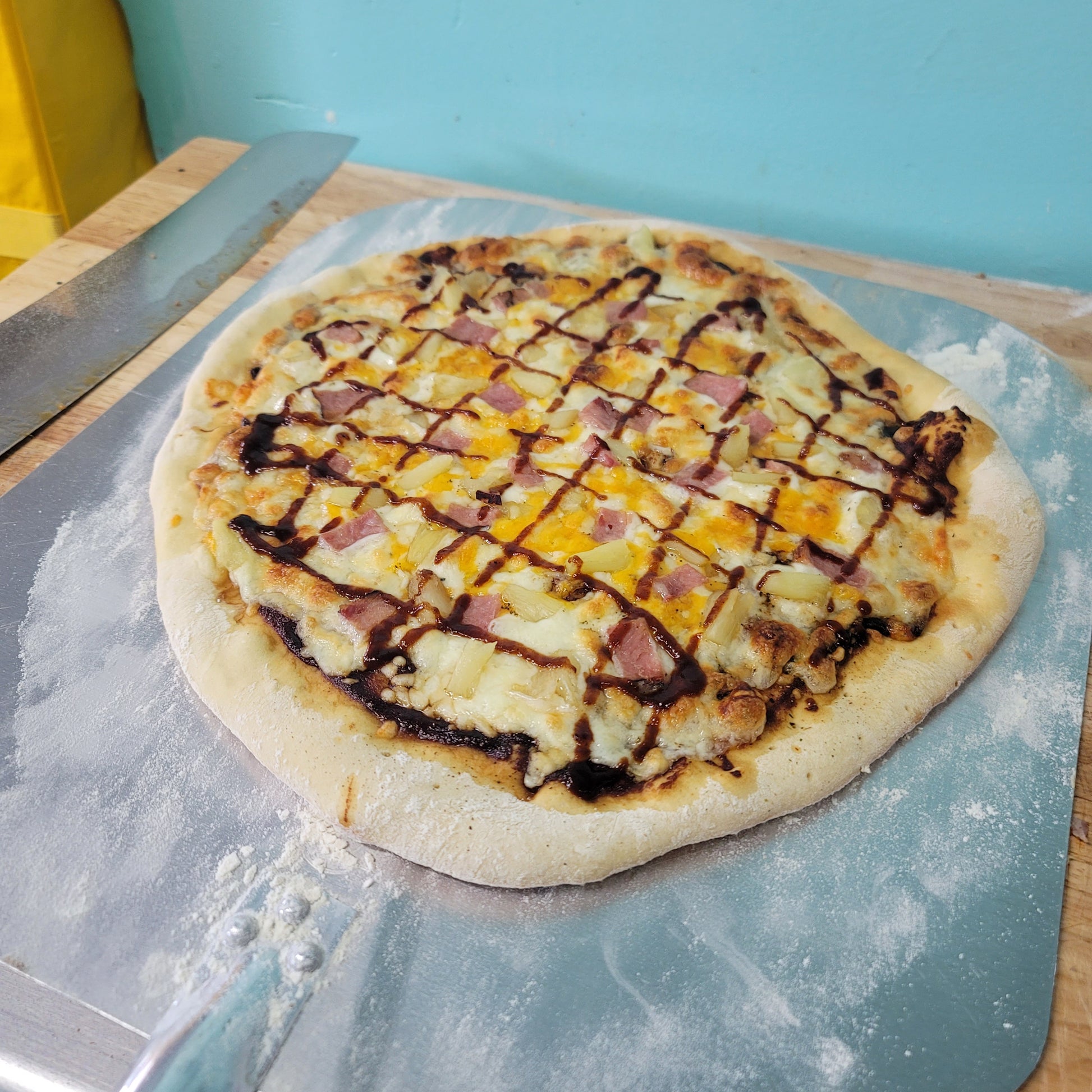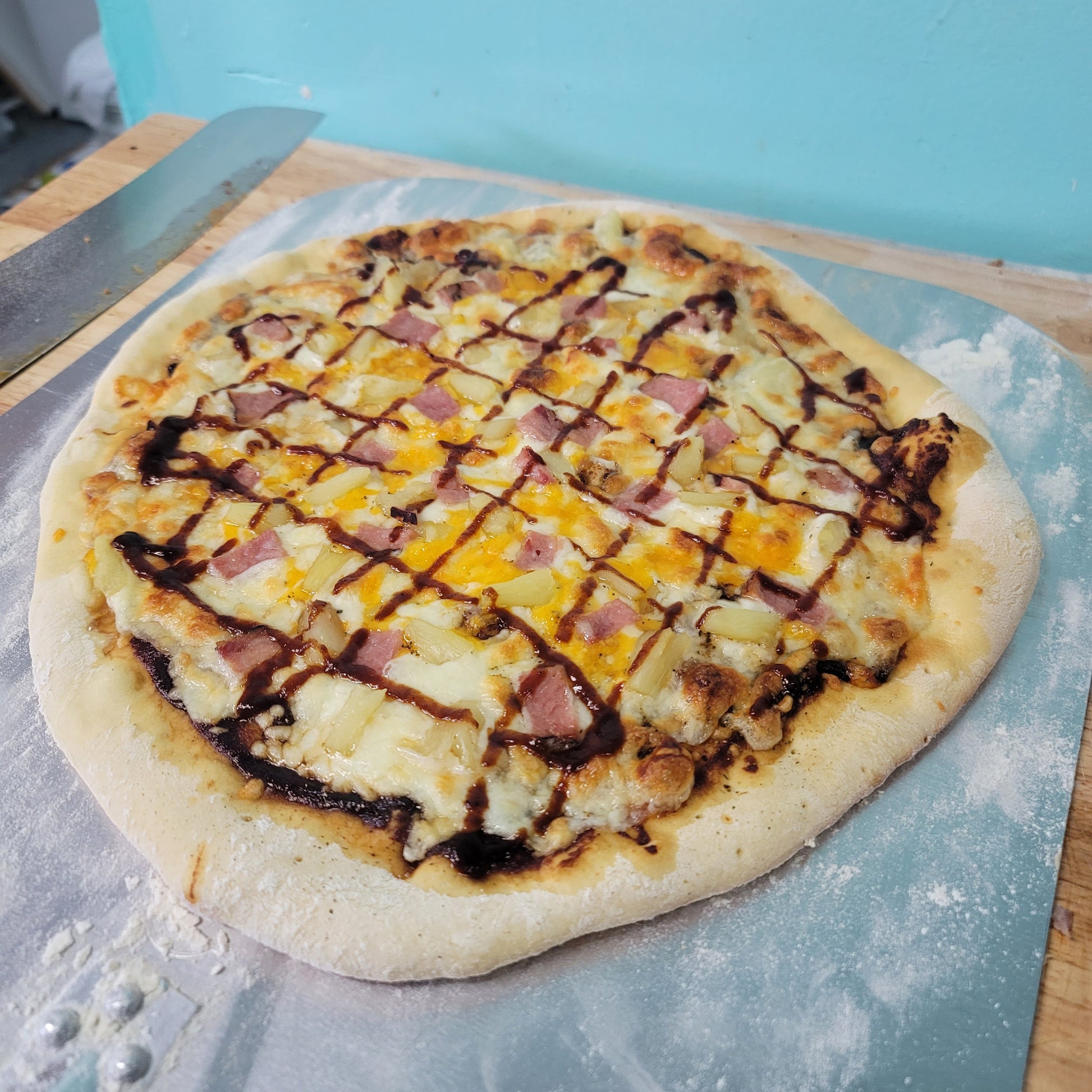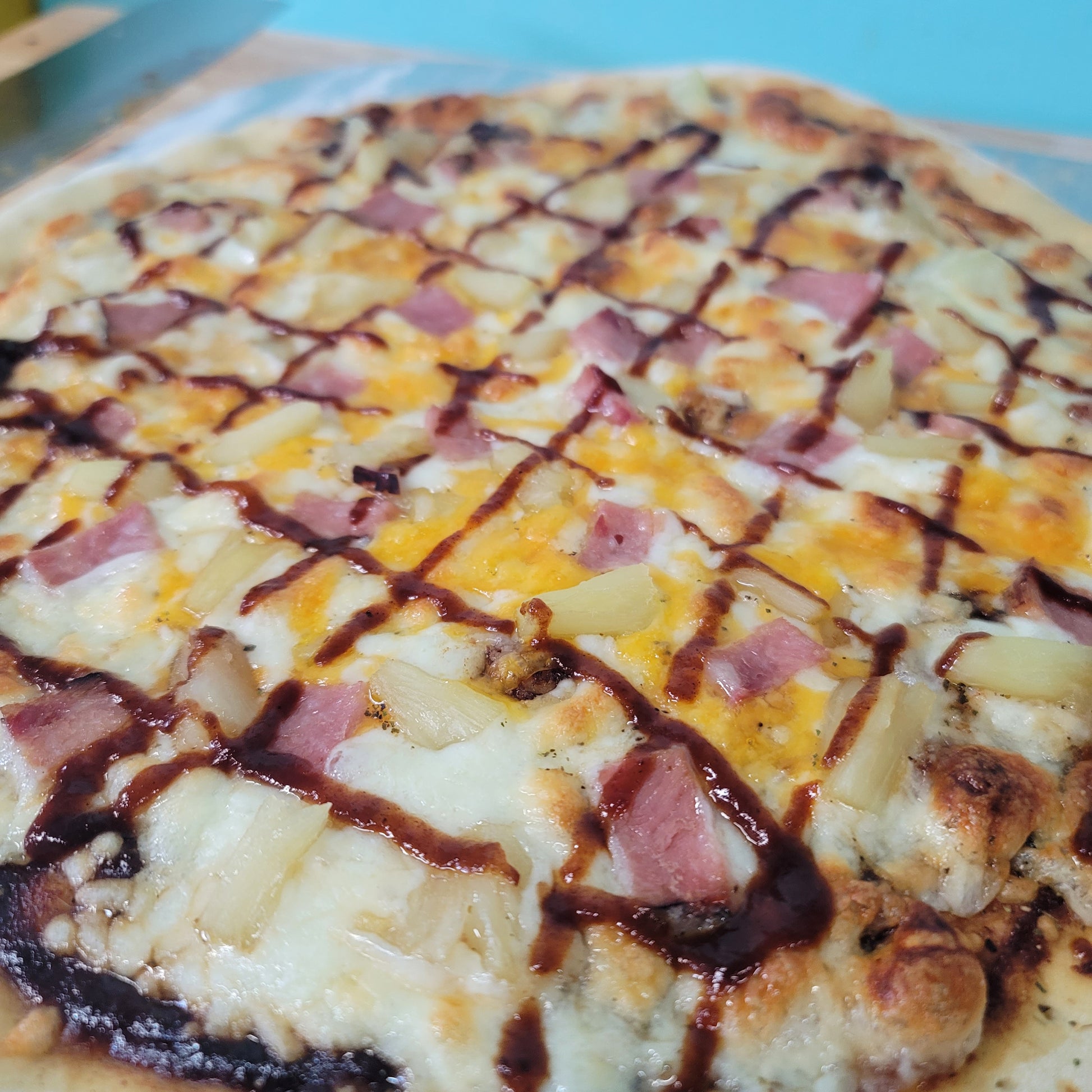 A BBQ ham pizza? Get out of here! Premium diced ham, slices of pineapple, house cheese blend, garlic, salt, pepper, all on a sweet & tangy BBQ sauce on our home style sourdough starter crust!