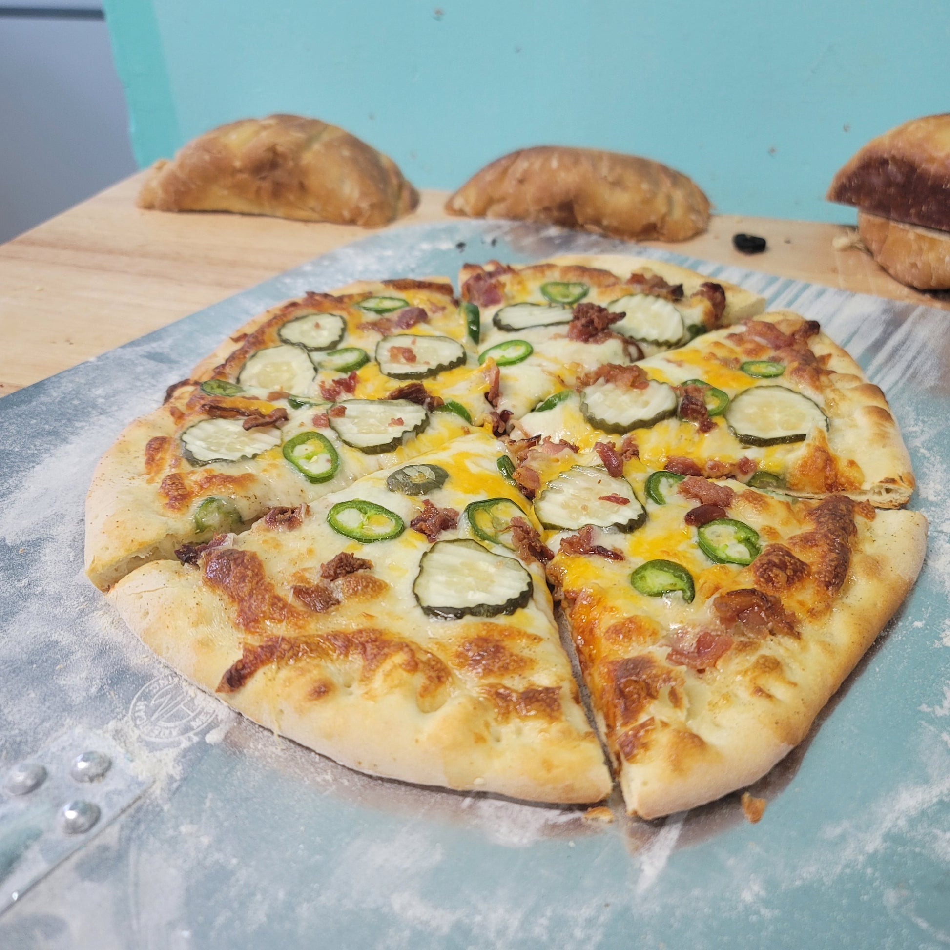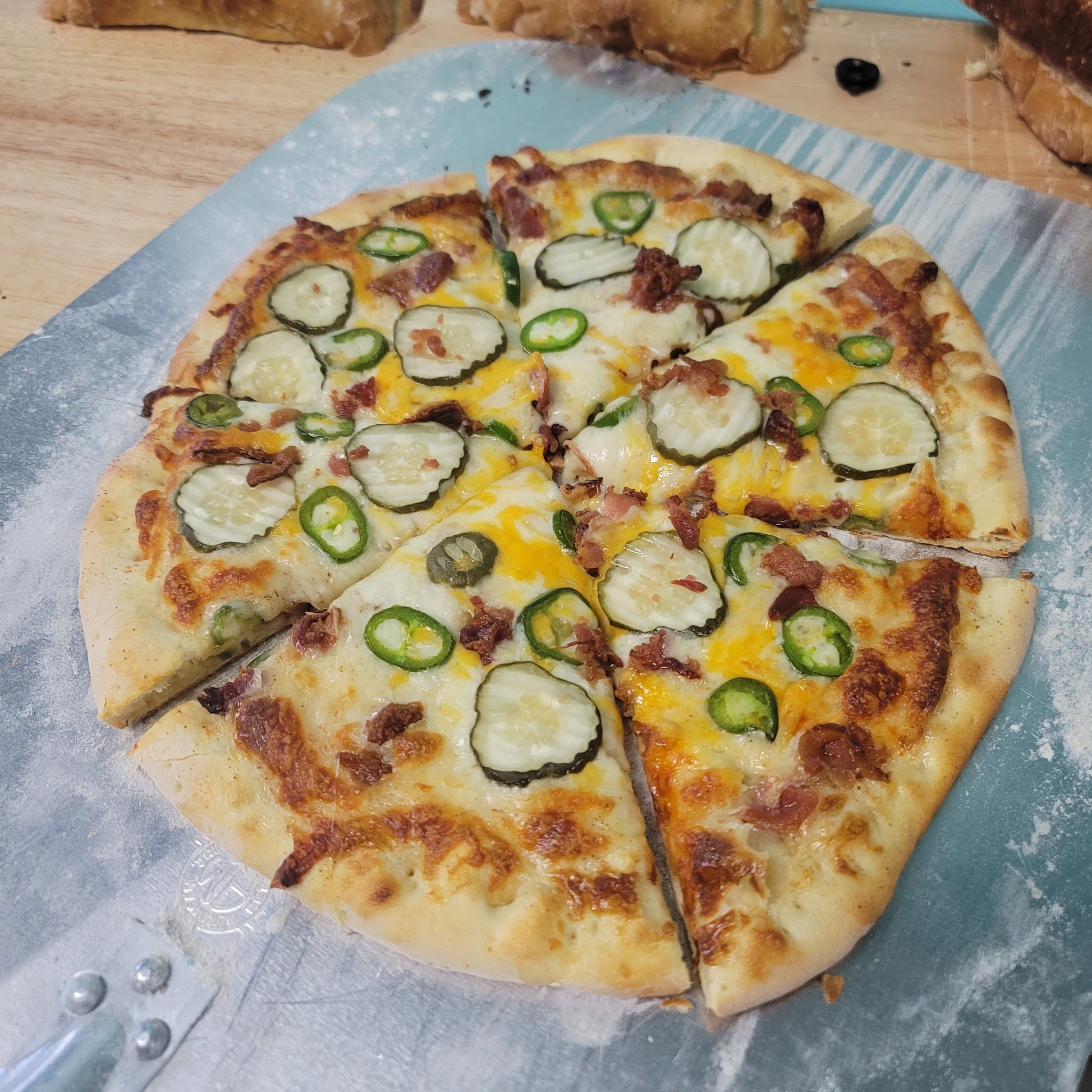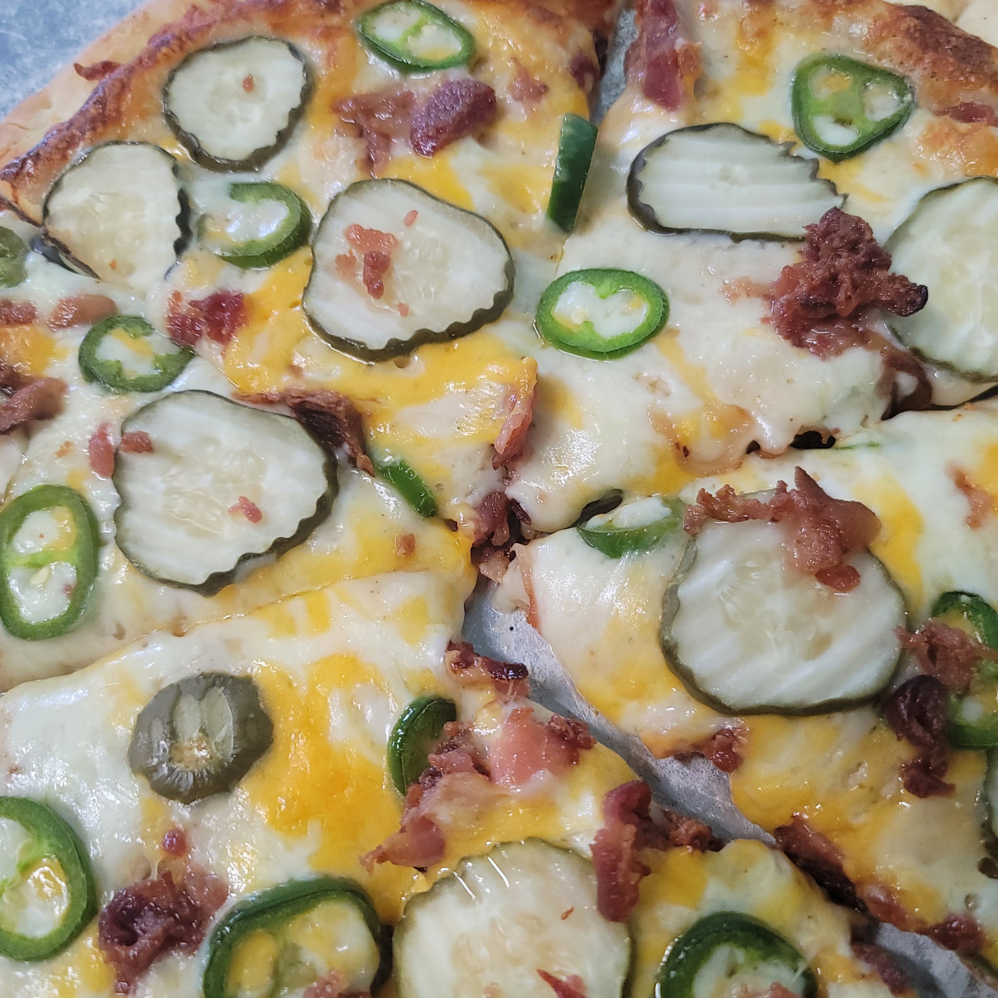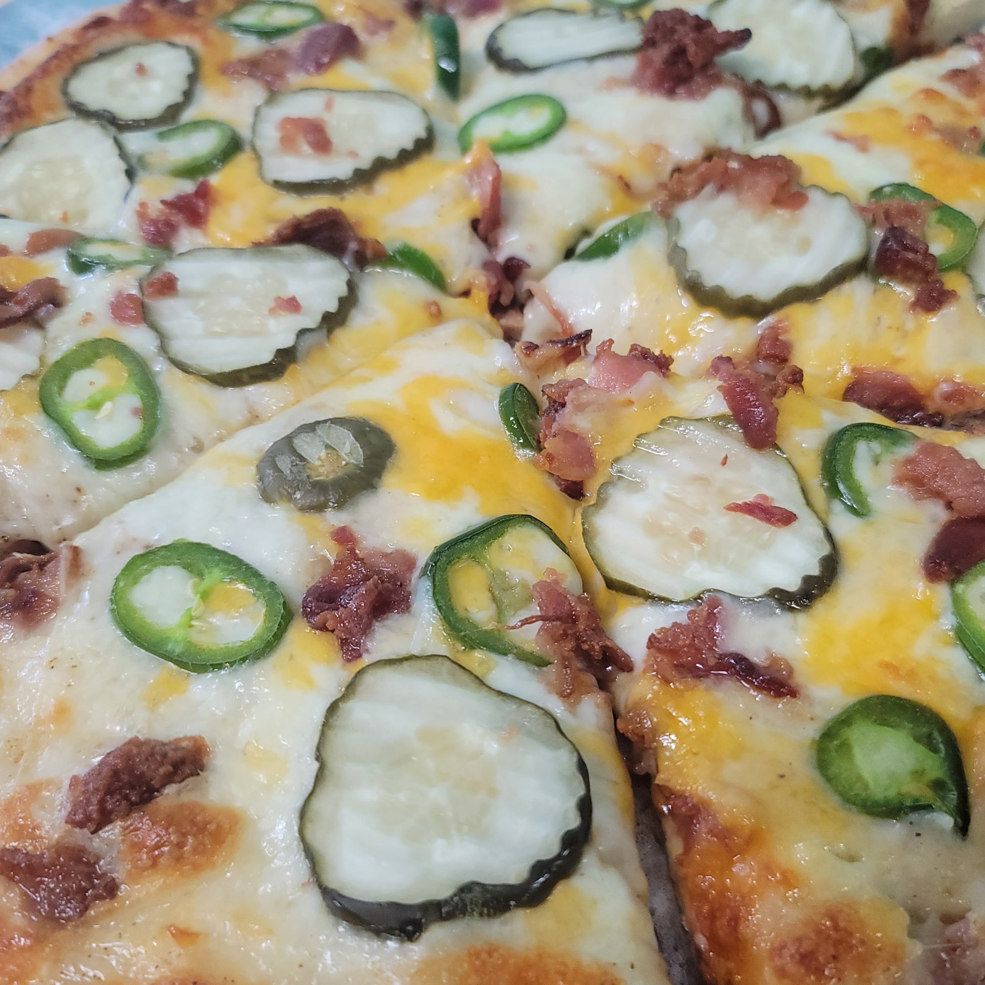 Dill pickle chips, jalapeno slices, and bacon on our home style crust with white sauce with mozzarella and cheddar!
