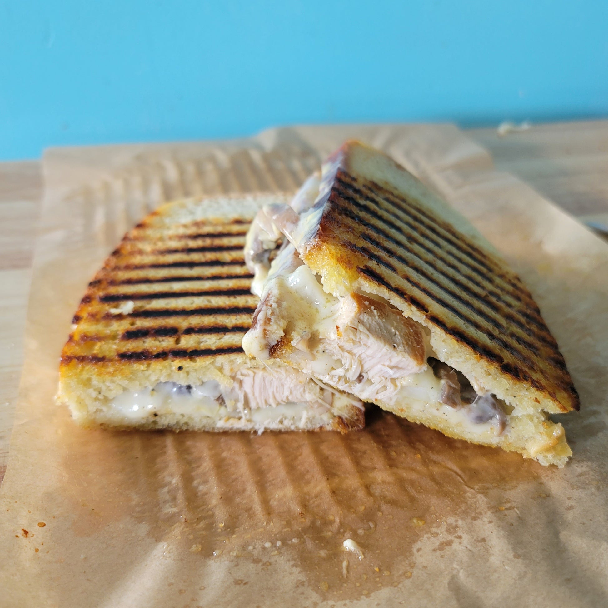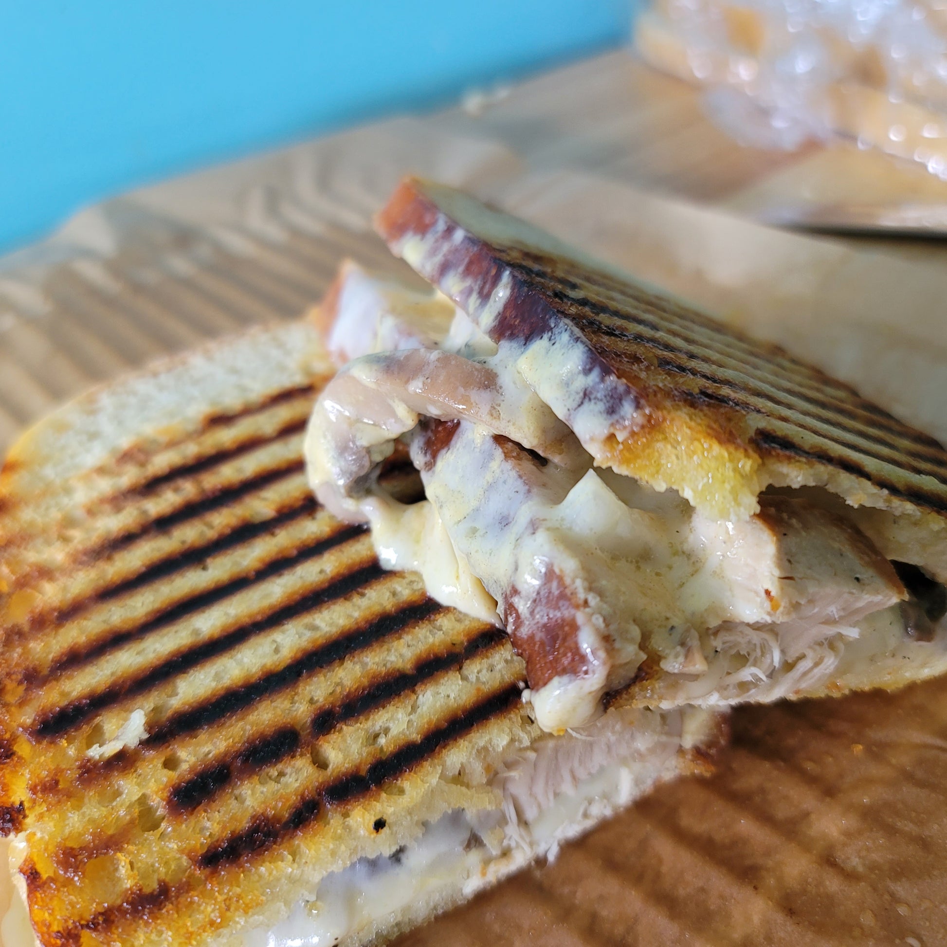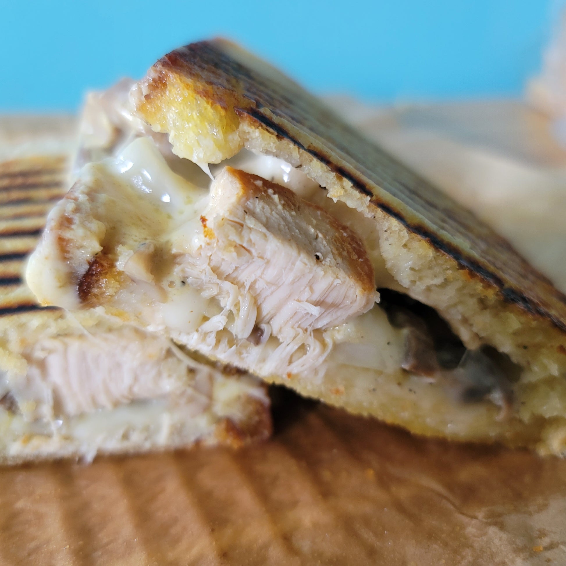 Pan fried & seared chicken breast, mushrooms, onions, Swiss or provolone cheese, mayo & stone ground Dijon mustard pressed between two slices of your choice of home style sourdough, artisan white bread or focaccia.