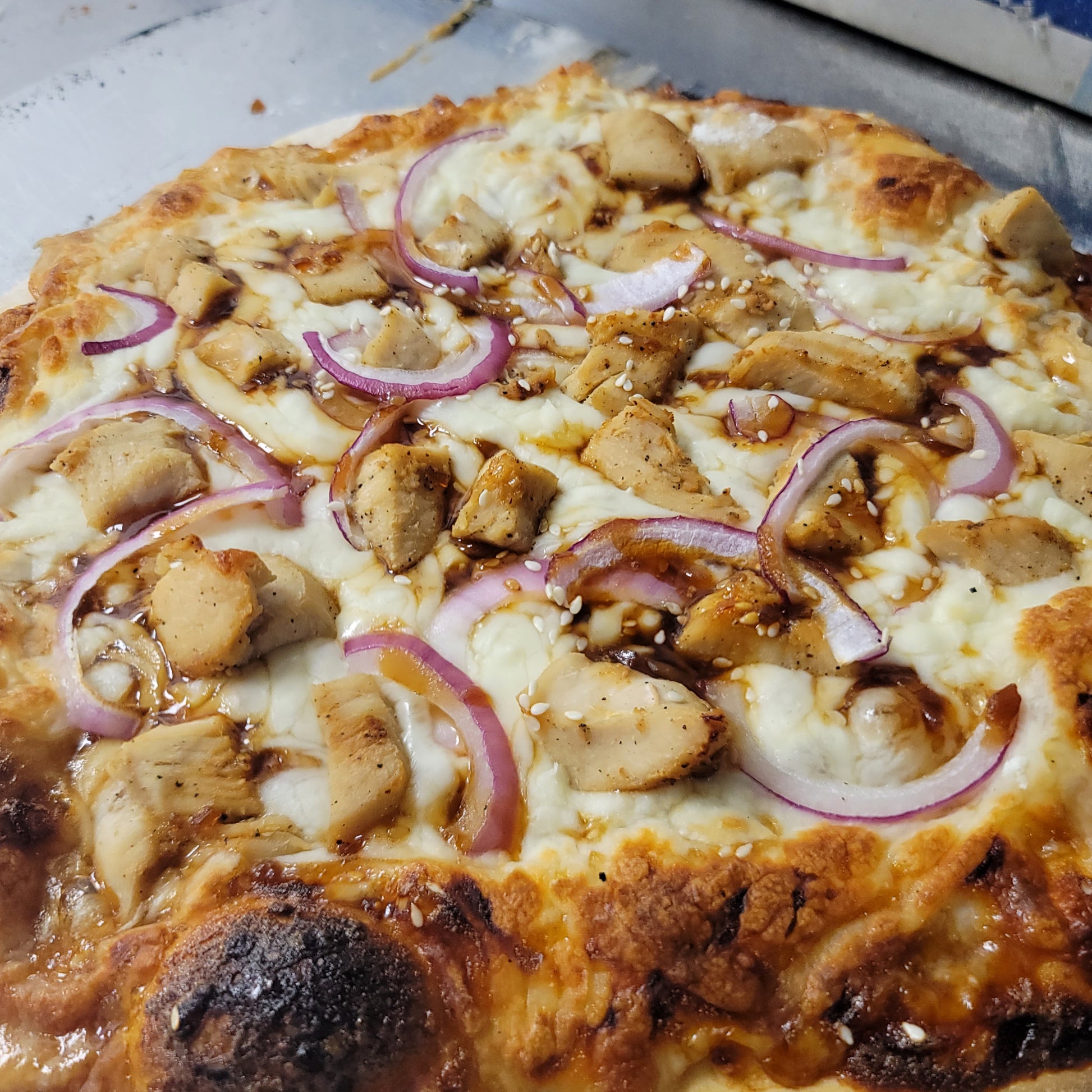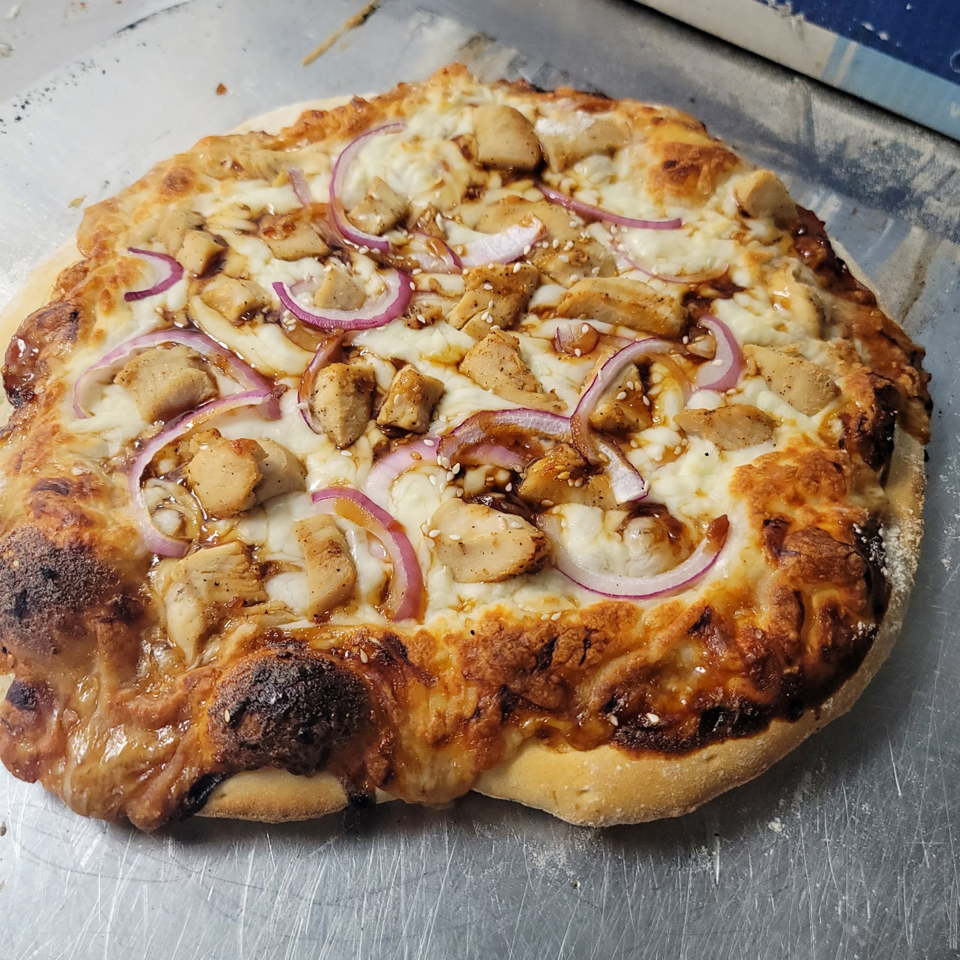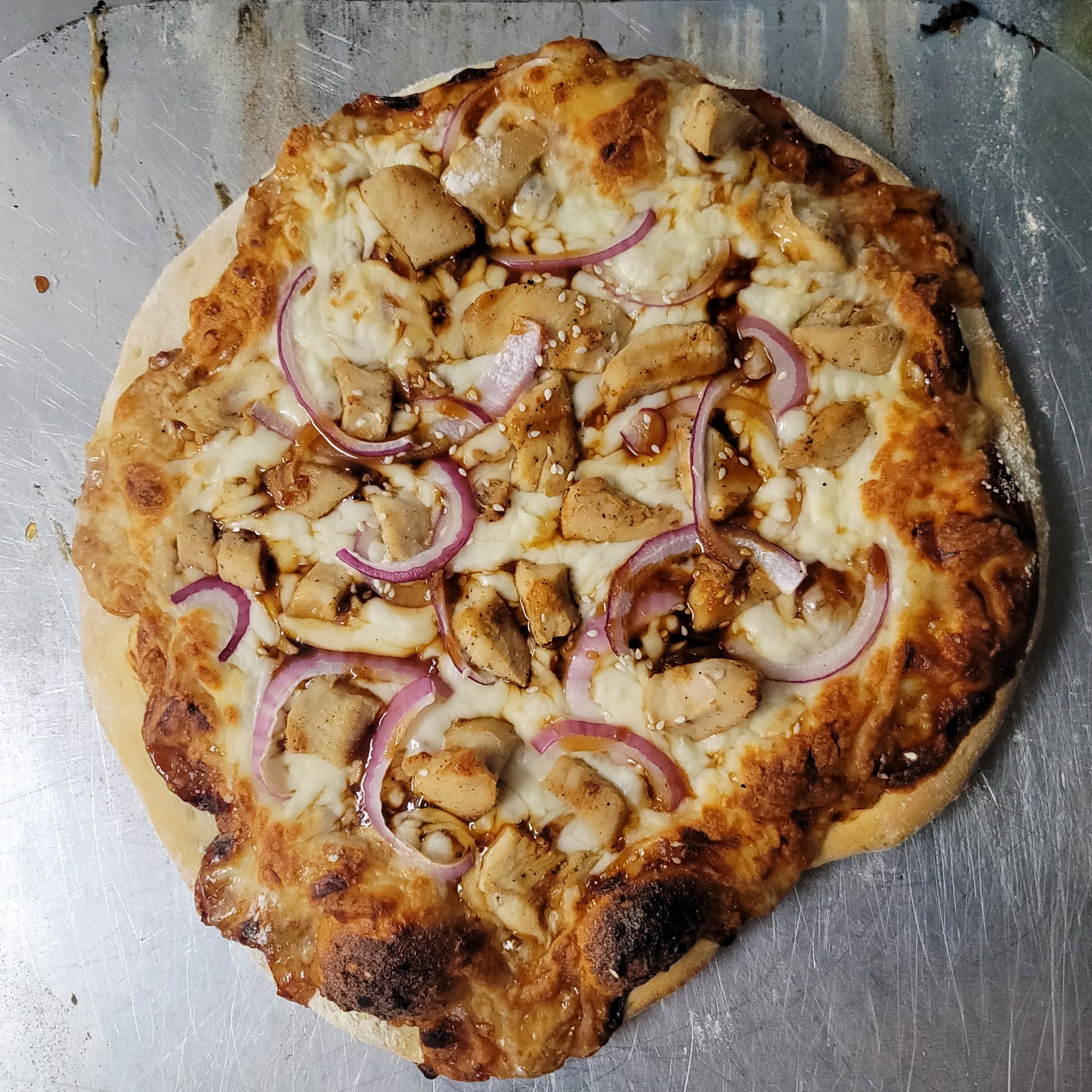 The Samurai brings Japanese-inspired flavors to pizza with tender teriyaki chicken, a savory umami-rich sauce, and a delicate finish of white sesame seeds. This expertly crafted pie balances sweet and savory notes while delivering the satisfying depth that teriyaki is known for. Each bite combines succulent chicken with the nutty complexity of sesame, creating a sophisticated departure from traditional pizza offerings. Perfect for those seeking bold, globally-inspired flavors.
