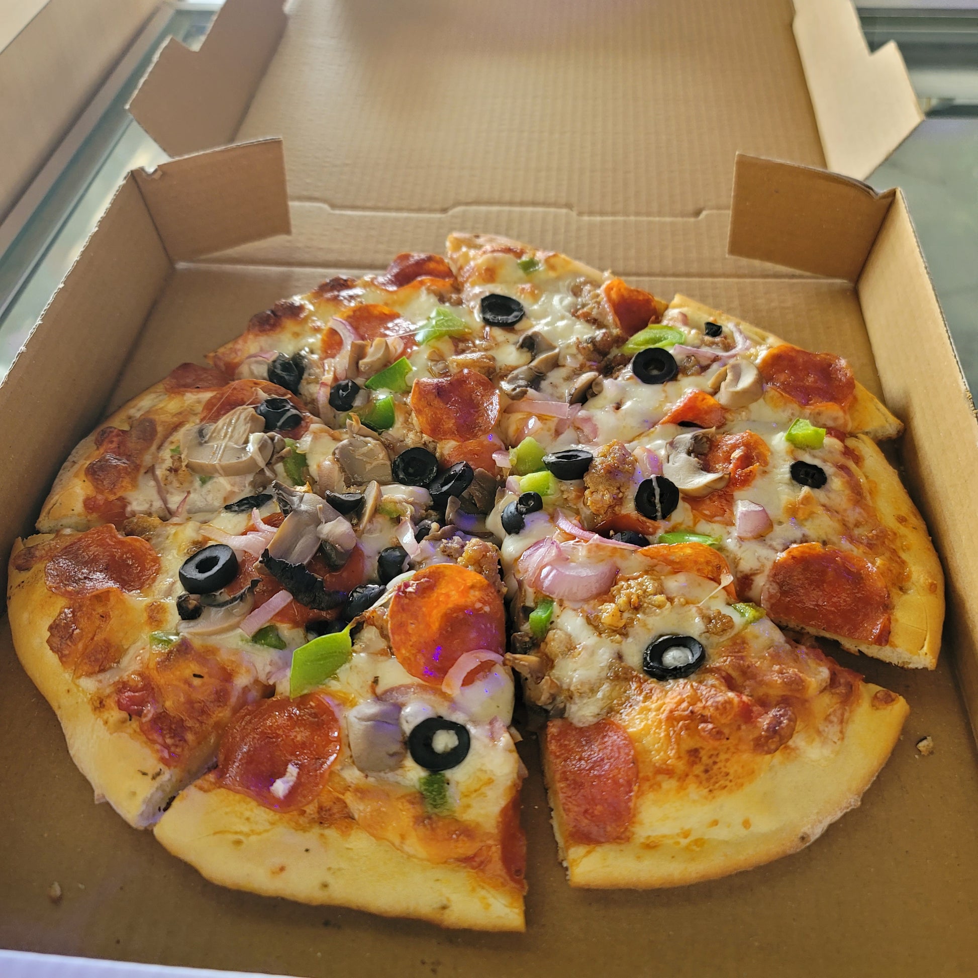 The Supreme Groove brings together all the classics in perfect harmony. Loaded with premium pepperoni, ground pork, fresh bell peppers, red onions, black olives and mushrooms on a bed of melted mozzarella and our signature sauce. Every slice delivers bold, satisfying flavors that make this pizza a timeless favorite. Perfect for those who love a supreme experience.