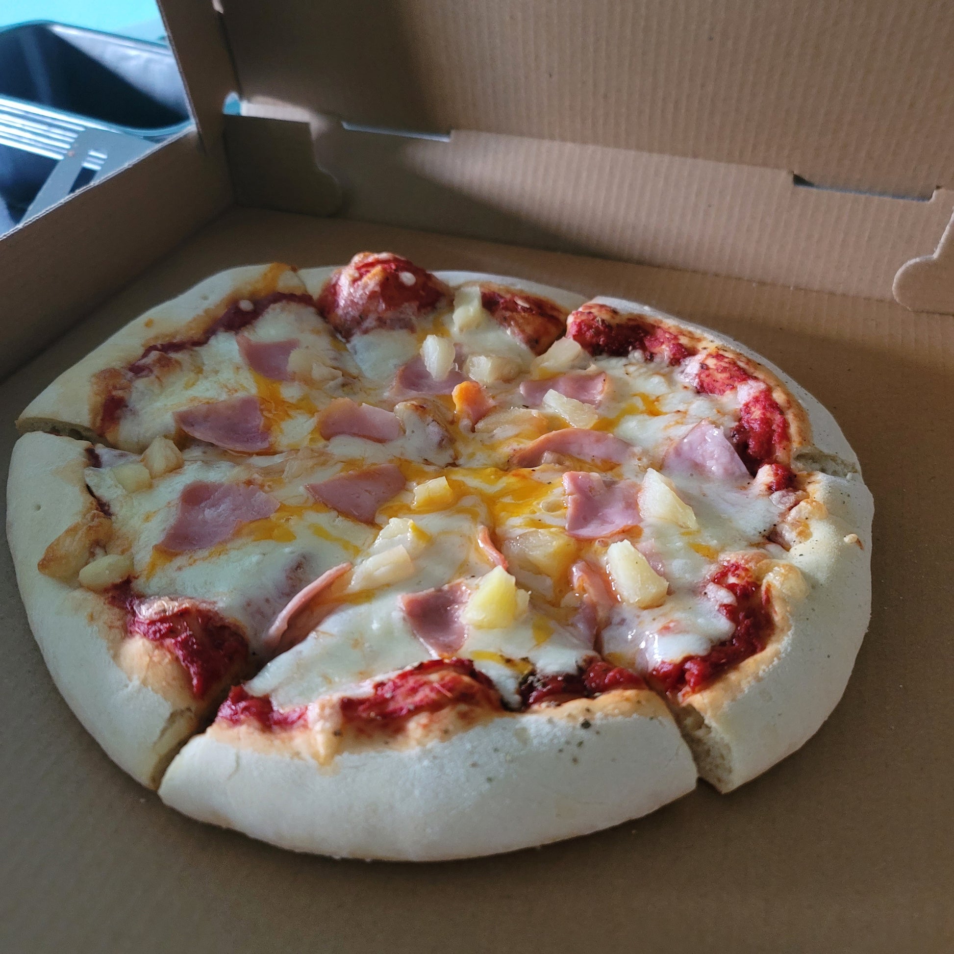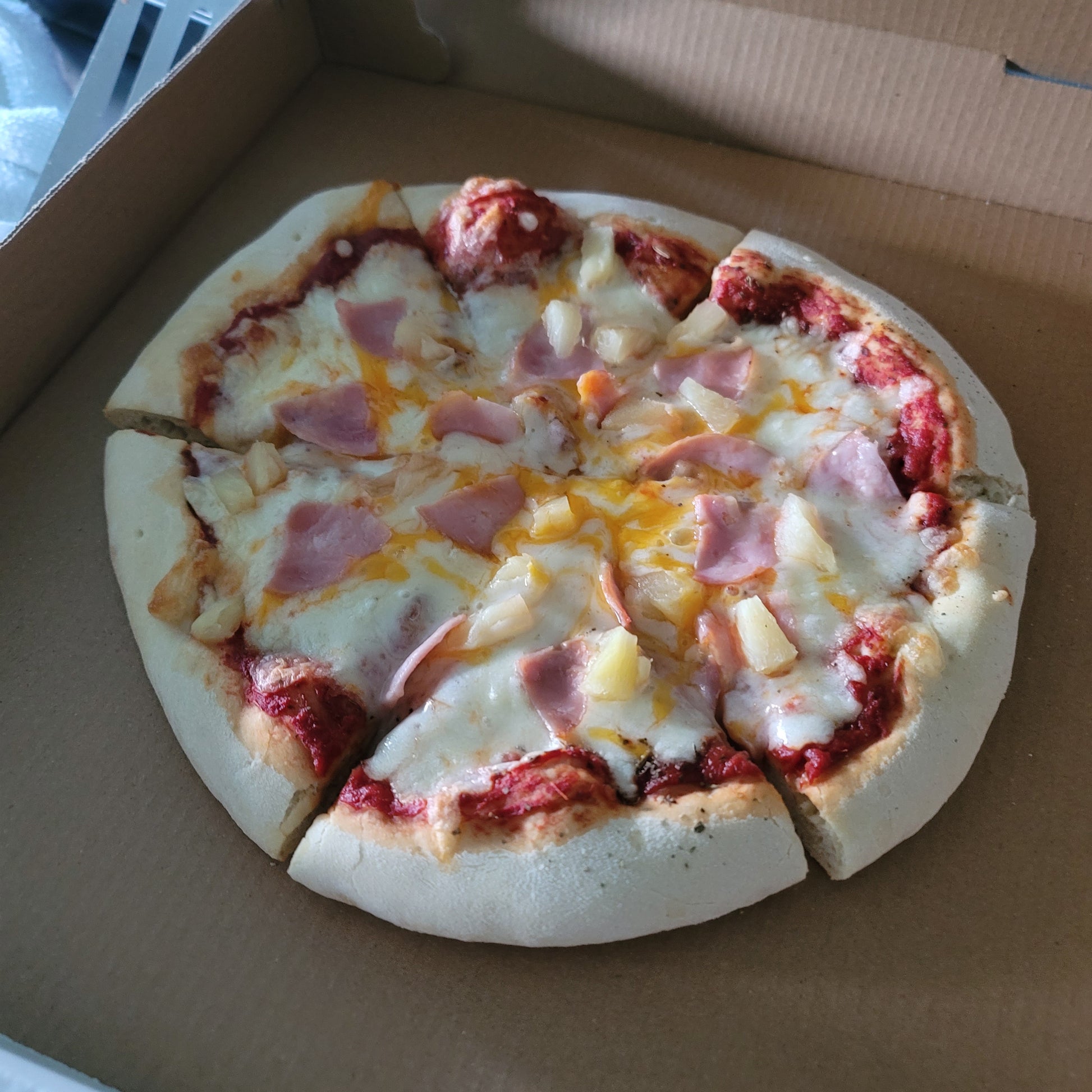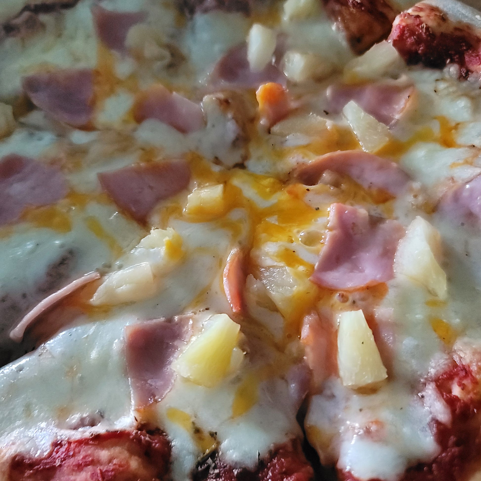 Uh, we just want a "Normal" Hawaiian pizza please! Classic Canadian bacon & pineapple on our house cheese blend, garlic, salt, pepper, on red sauce on our home style sourdough starter crust!